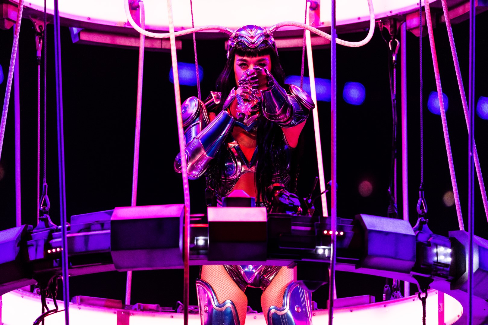 As the stagehands vehemently work to put the final touches on Katy Perry’s set, fans could be seen laughing, singing, taking selfies and pictures of the set and of one another. To bide the time and keep the fans in high spirits, a cameraman of Katy Perry’s walked around the venue interacting with the crowd utilizing a set camera that would display eager/brave fans on the stage light wall monitor. Excitement filled the venue as the lights shut off, everyone was instantly surrounded by a barrage of screams and cheers that grew louder, you could feel it running through your body. The middle of the stage opened, and a structure of cables towered upward, in the middle Katy Perry is slowly lifted and presented to the crowd plugged into the “Matrix”.