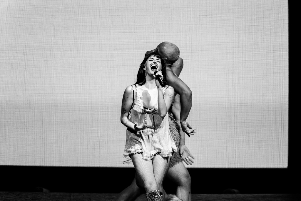 Rebecca Black kicked off the event to a sea of fans enthralled in the spectacle of the tour visuals, displayed on the large light wall monitors which were set up in a broken design. Rebecca presented her set with her back-up dancers holding a self-made banner decorated with two leopard pattern crosses and her name “Rebecca Black” presented in the middle as she peaked out from behind hitting the fans with the song “American Doll” off her album SALVATION. Her set mainly consisted of songs off her album SALVATION, songs such as “Twist the Knife”, “Do You Even Think About Me?”, “TRUST!” and “Salvation”. Her performance met with cheer as fans danced, jumped and sang along with her; a precursor to what was to unfold for Katy Perry.