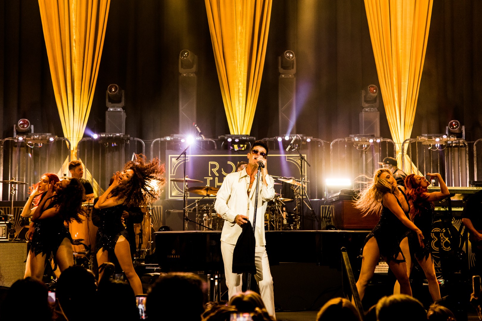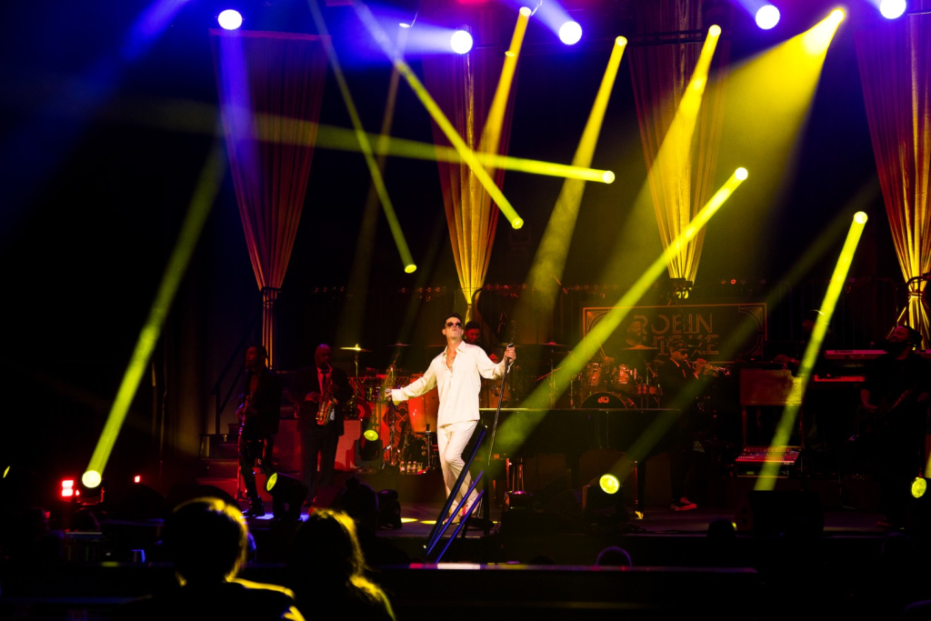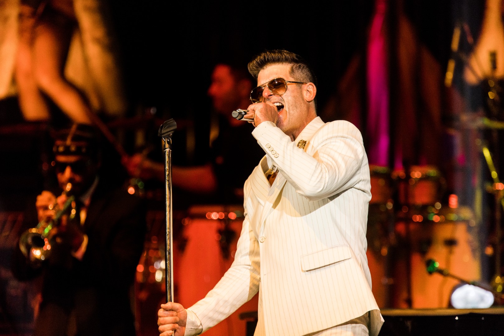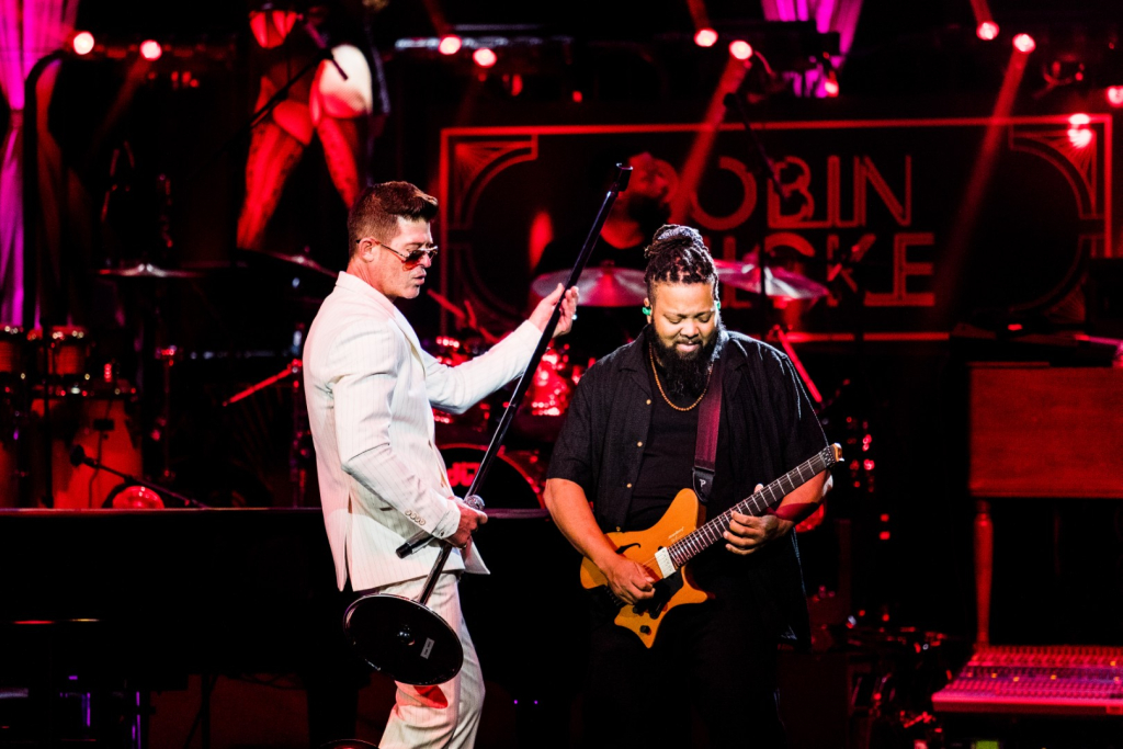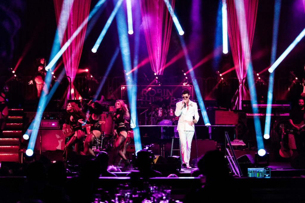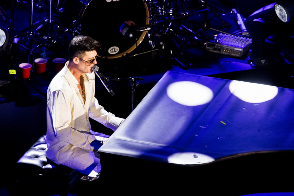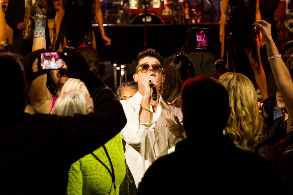 As Sonna closed her set, the anticipation for the main event could be felt as members of Robin Thicke’s band began to take their positions on stage. The band begins playing an intro, a layered saxophone, trumpet, guitar, bass, keyboard and drum, upbeat jazz jam that builds up to the moment Robin walks out on the stage. As Robin begins his first of many songs, the show girls in the audience in a timely and synced manner begin walking up through the crowd toward the stage. Lights shine, the music finds its way through the audience, the background dancers synchronize and, in an instant, everyone is teleported to a Vegas showroom.