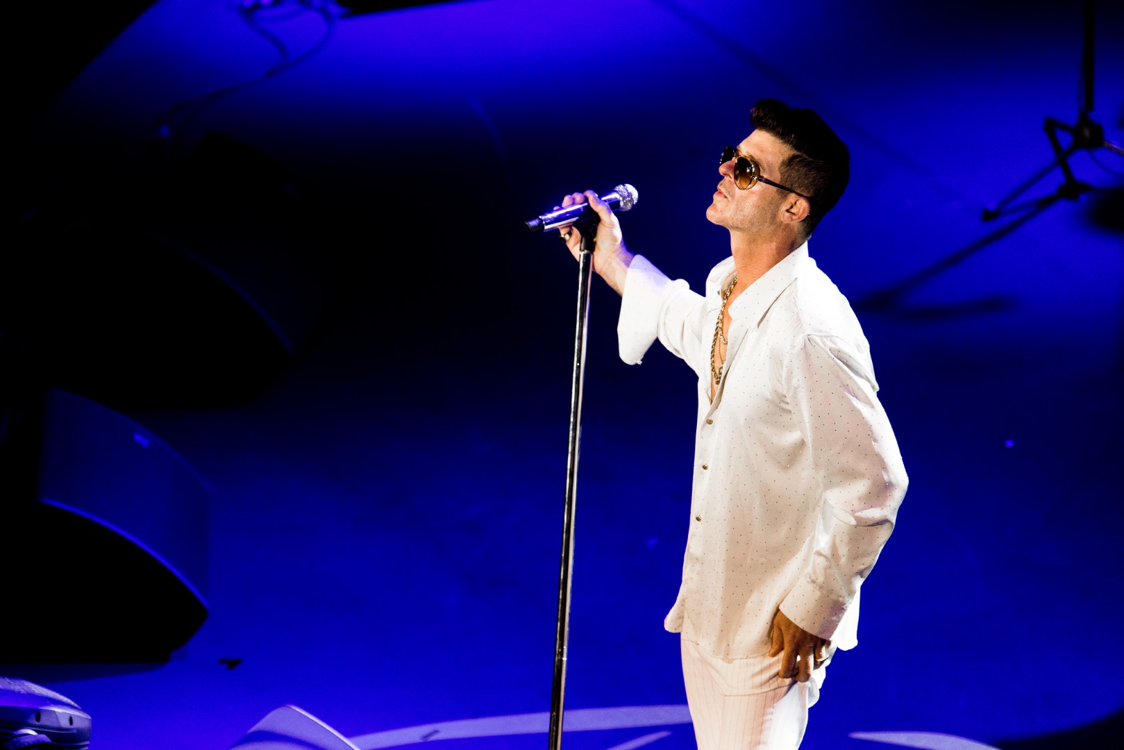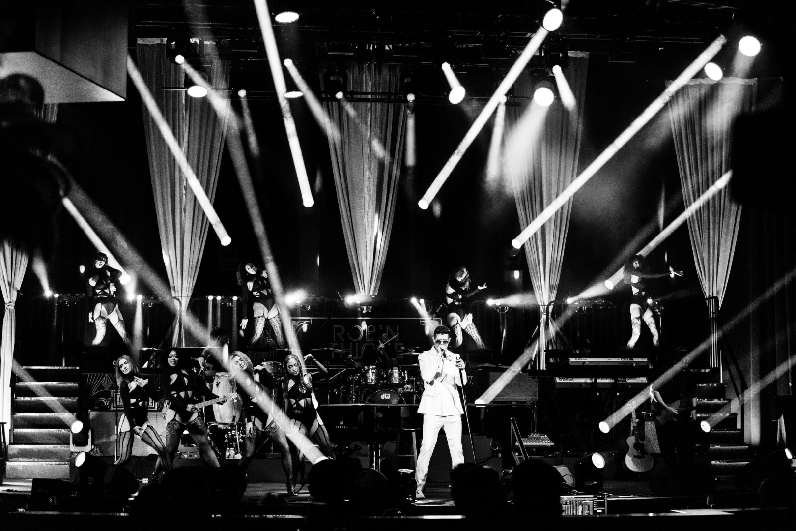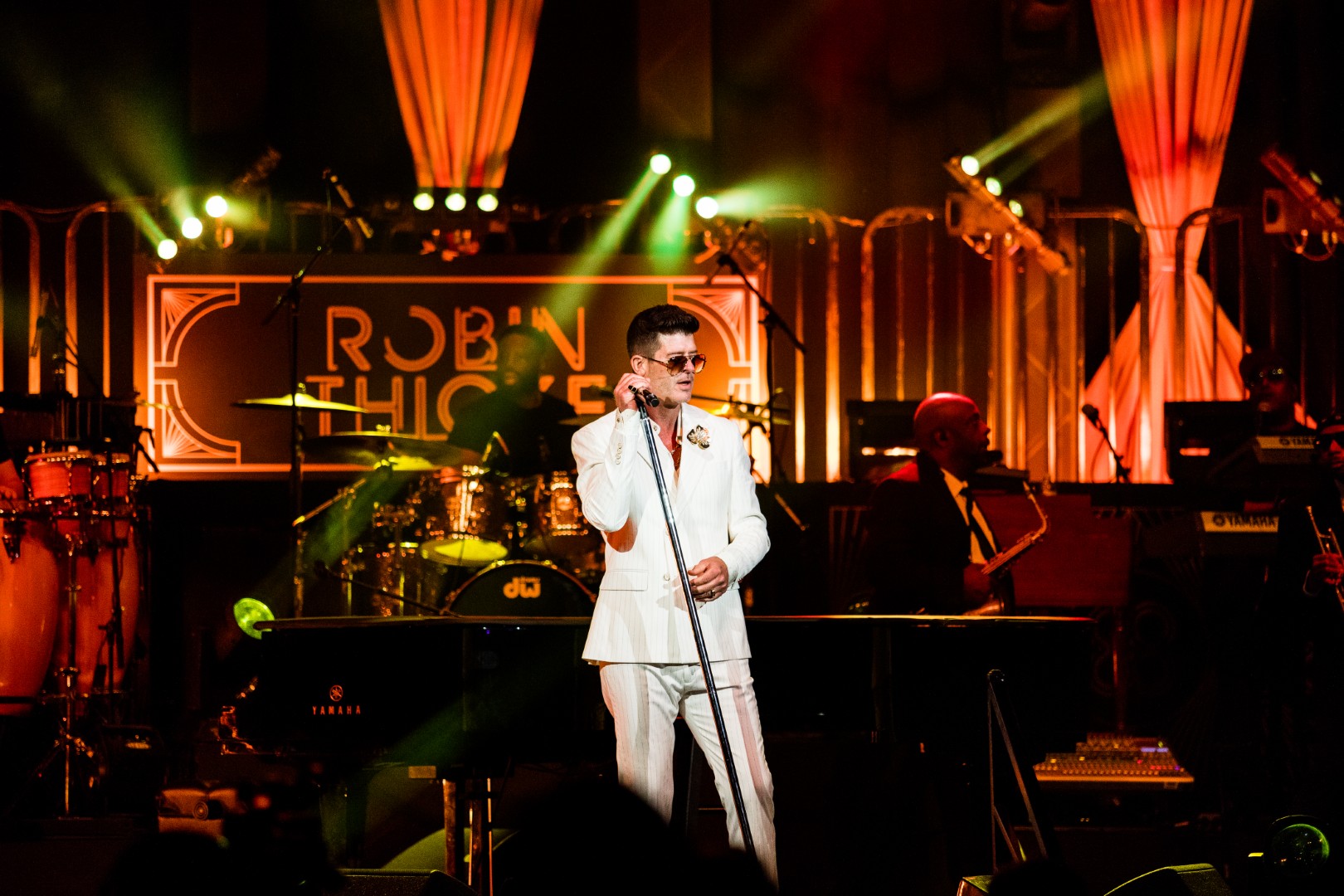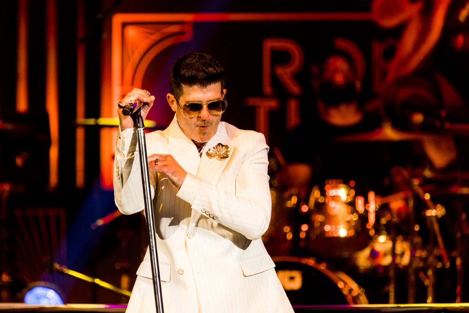 As Sonna closed her set, the anticipation for the main event could be felt as members of Robin Thicke’s band began to take their positions on stage. The band begins playing an intro, a layered saxophone, trumpet, guitar, bass, keyboard and drum, upbeat jazz jam that builds up to the moment Robin walks out on the stage. As Robin begins his first of many songs, the show girls in the audience in a timely and synced manner begin walking up through the crowd toward the stage. Lights shine, the music finds its way through the audience, the background dancers synchronize and, in an instant, everyone is teleported to a Vegas showroom.