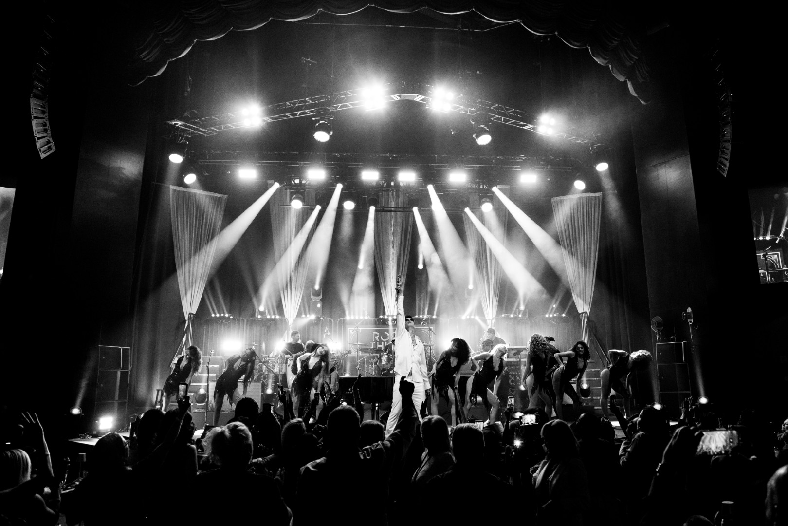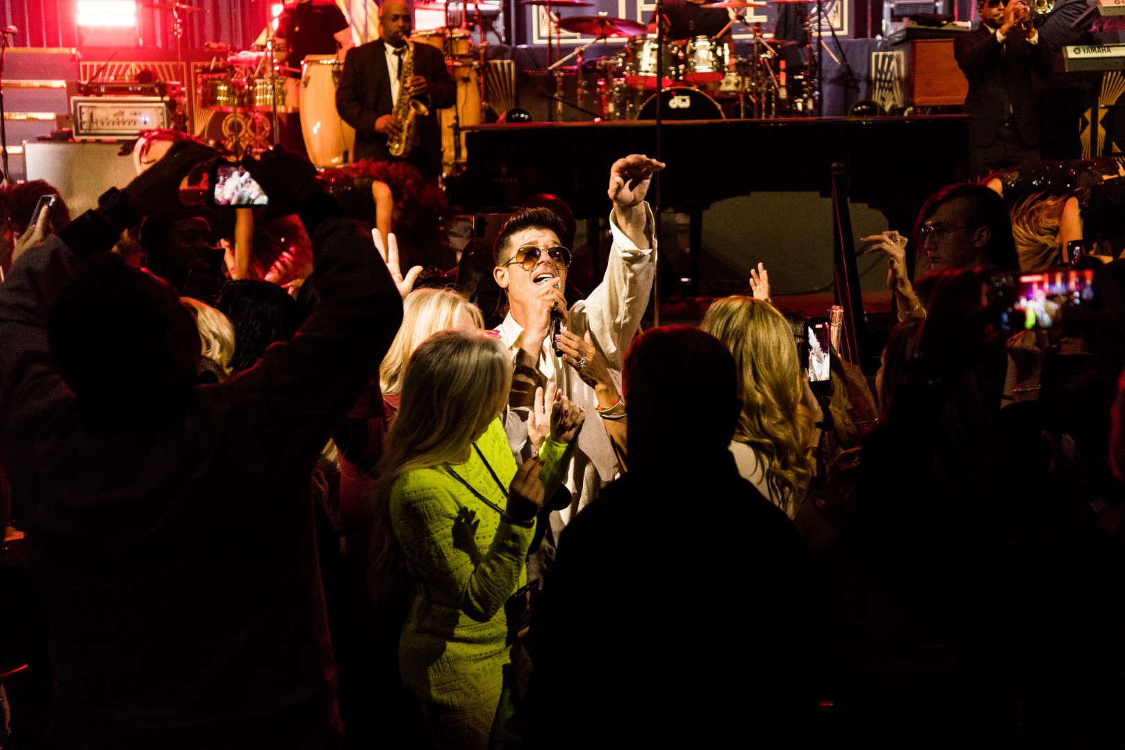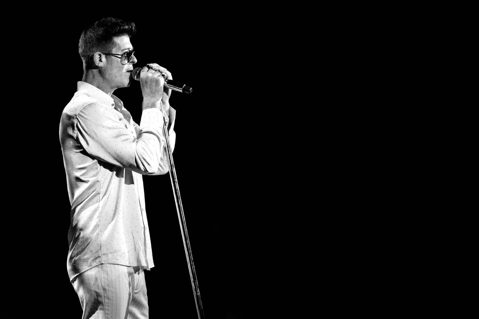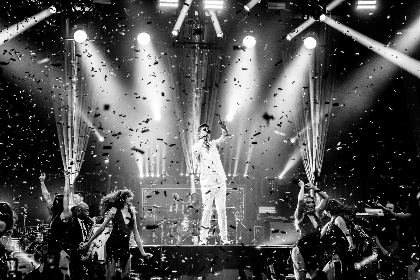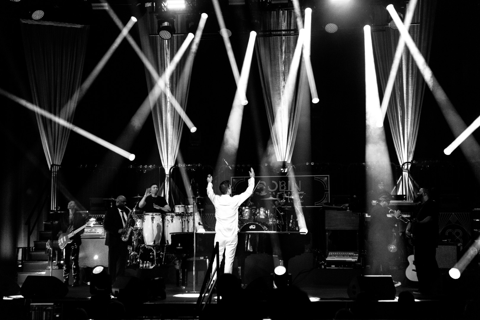 As Sonna closed her set, the anticipation for the main event could be felt as members of Robin Thicke’s band began to take their positions on stage. The band begins playing an intro, a layered saxophone, trumpet, guitar, bass, keyboard and drum, upbeat jazz jam that builds up to the moment Robin walks out on the stage. As Robin begins his first of many songs, the show girls in the audience in a timely and synced manner begin walking up through the crowd toward the stage. Lights shine, the music finds its way through the audience, the background dancers synchronize and, in an instant, everyone is teleported to a Vegas showroom.