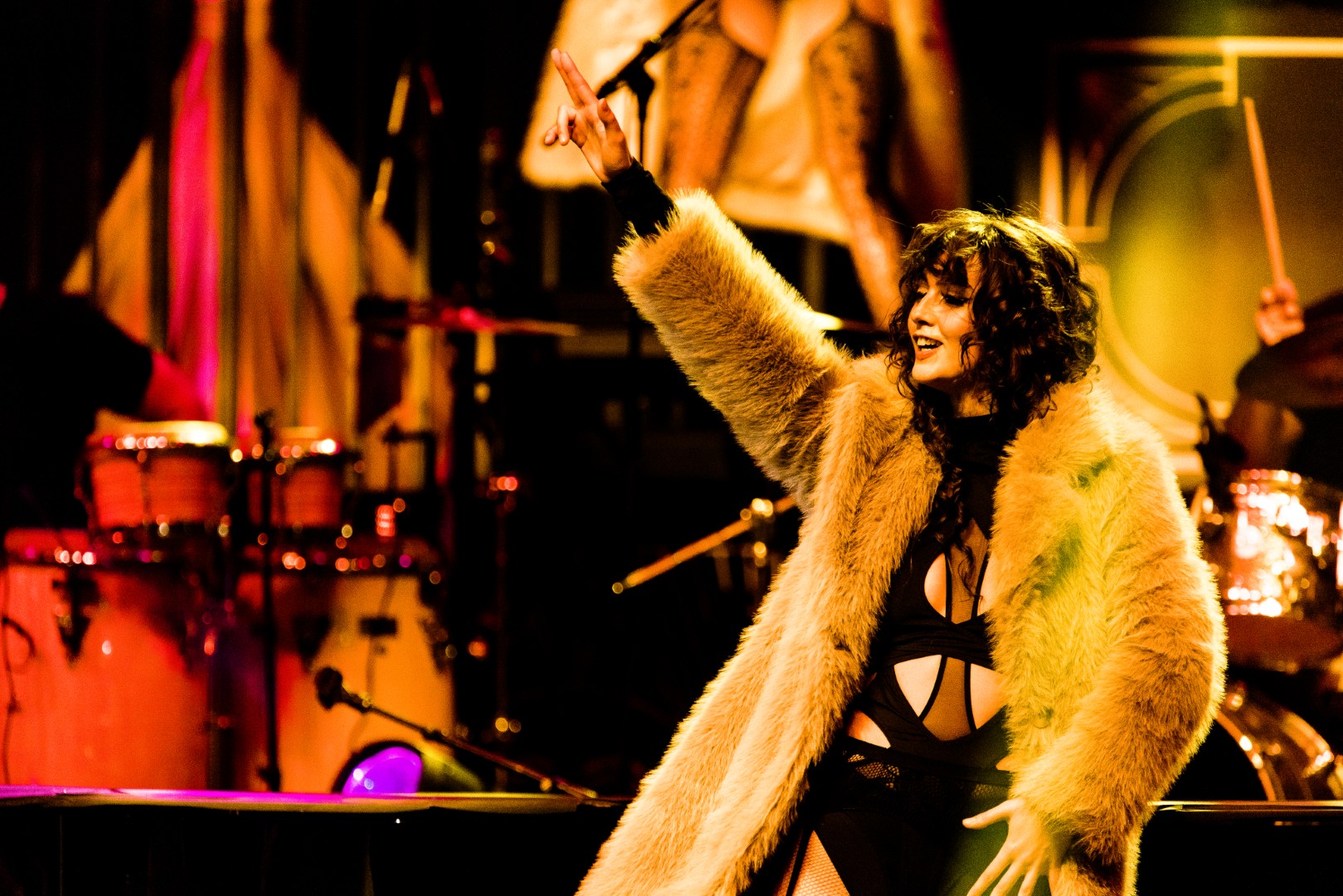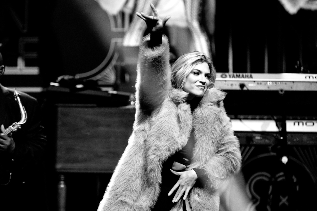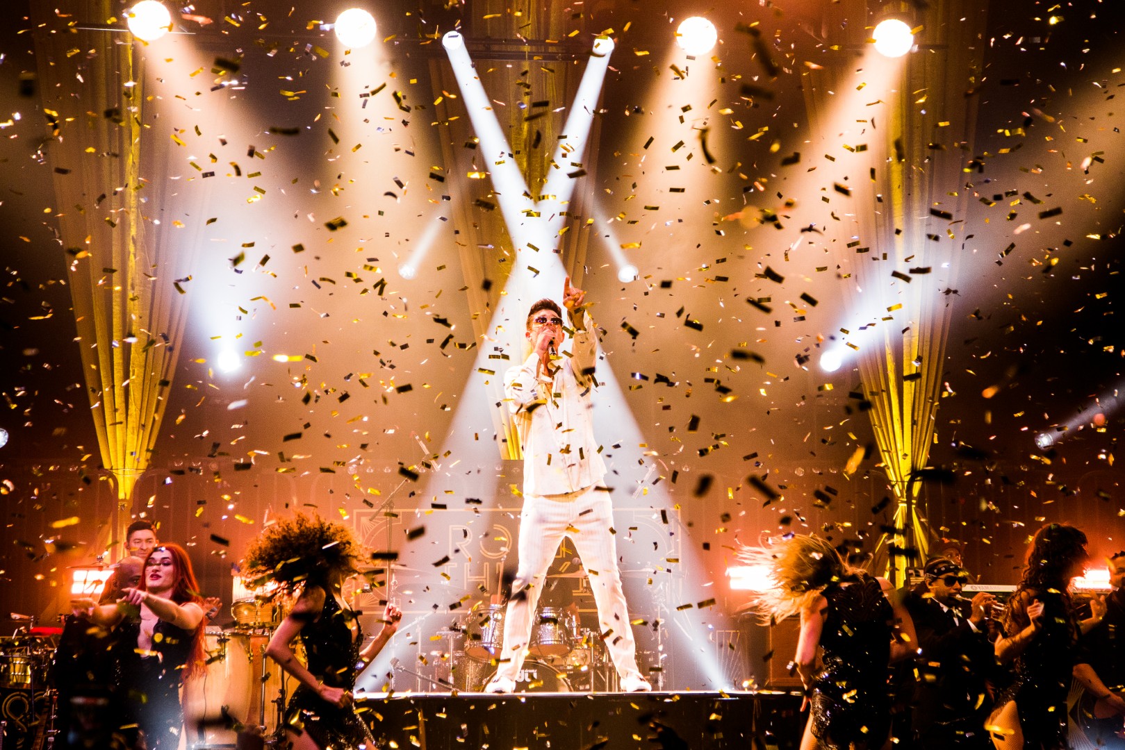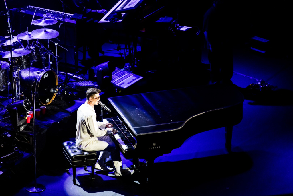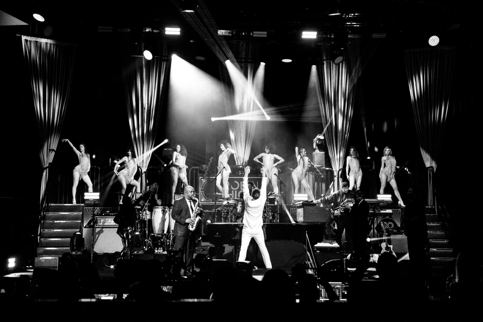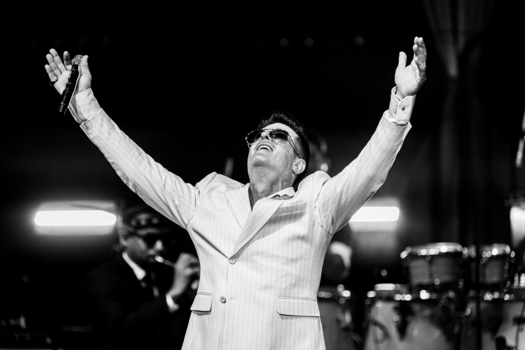 As Sonna closed her set, the anticipation for the main event could be felt as members of Robin Thicke’s band began to take their positions on stage. The band begins playing an intro, a layered saxophone, trumpet, guitar, bass, keyboard and drum, upbeat jazz jam that builds up to the moment Robin walks out on the stage. As Robin begins his first of many songs, the show girls in the audience in a timely and synced manner begin walking up through the crowd toward the stage. Lights shine, the music finds its way through the audience, the background dancers synchronize and, in an instant, everyone is teleported to a Vegas showroom.