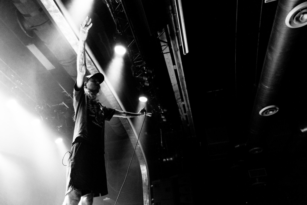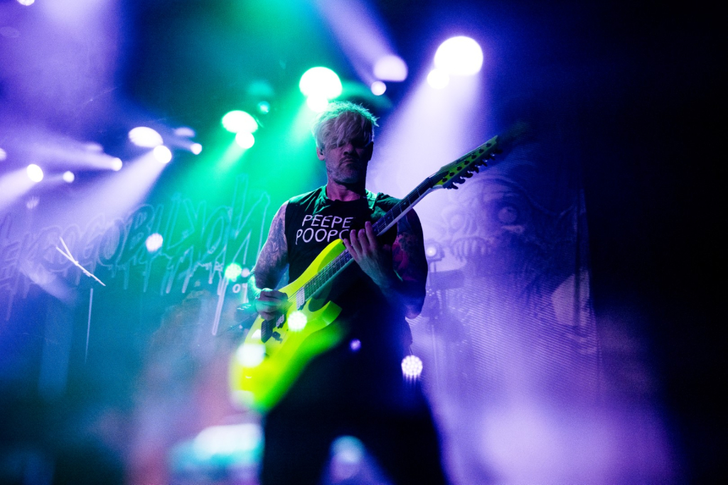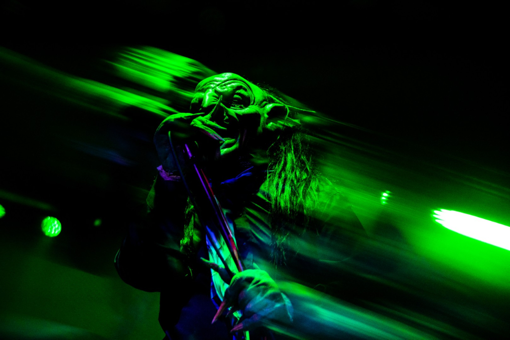 Nekrogoblikon starts their set with the Pokémon theme song leading them in, as a large blow-up goblin head stares down the audience. For a few minutes the venue is filled with fans singing along as the song slowly fades and the members of the band take the stage; the singing turns to cheers. As they begin their first song of the evening, John Goblikon walks out and the venue fills with a cheer of excitement then the chaos starts. Piercing the crowd with high-pitch squeals, deep screams and a comedic improv goblin walking around on stage hyping the crowd provided for a different but complimentary performance for the evening.